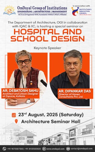 Department of Architecture, OmDayal Group of Institutions is organising a Seminar on “Hospital and School Design” on August 23, 2025 (Saturday) at the Architecture Seminar Hall in collaboration with IQAC and IIC. Date: 23rd August, 2025 (Saturday) Venue: Architecture Seminar Hall Meet the Speakers Ar. Debotosh Sahu Post Hold: Architect and Urban Designer at Espace, […]