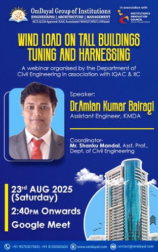 Date: 14th December, 2024 Time: 11 am Onwards Venue: Seminar Hall, Dept. of Architecture Curated by Ar. Abhijit Basak, Founder & Proprietor, Dot.Arch Arranged by Department of Architecture, OmDayal Group of Institutions