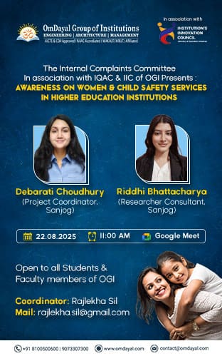 Date: 22nd August, 2025 Time: 11:00 am Platform: Google Meet Open to all Students and Faculty members of OmDayal Group of Institutions Meet the Speakers Debarati Choudhury Post Hold: Project Coordinator, Sanjog Riddhi Bhattacharya Post Hold: Researcher – Consultant, Sanjog Coordinator: Rajlekha Sil, Contact Number: +91 8697977954