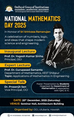 National Mathematics Day 2025 organised by Department of Mathematics, in association with IQAC & IIC. Date: 20th December 2025 (Saturday) Venue: Seminar Hall, Architecture Building Inaugural Lecture Prof. Dr. Yogesh Kumar Sinha Principal, ODGI Expert Lecture Prof. Dr. Guruprasad Samanta Department of Mathematics, IIEST Shibpur Topic: Applications of Mathematics in Engineering Special Talk Dr. Prosenjit […]