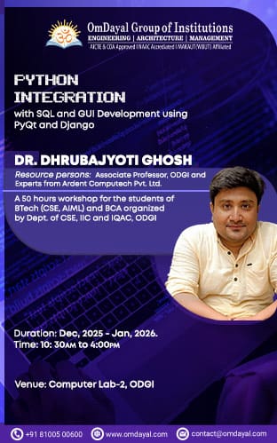 A 50 hours workshop for the students of BTech (CSE, AIML) and BCA organized by Dept. of CSE, IIC and IQAC, ODGI Resource persons: Dr. Dhrubajyoti Ghosh, Associate Professor, ODGI and Experts from Ardent Computech Pvt. Ltd. Duration: Dec, 2025 – Jan, 2026. Time: 10.30 am to 4 pm Venue: Computer Lab-2, ODGI