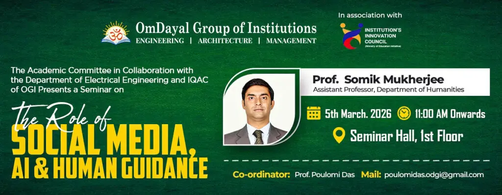 The Academic Committee in association with Department of Electrical Engineering, IIC and IQAC of OmDayal Group of Institutions presents a Seminar on “The Role of Social Media, AI & Human Guidance”