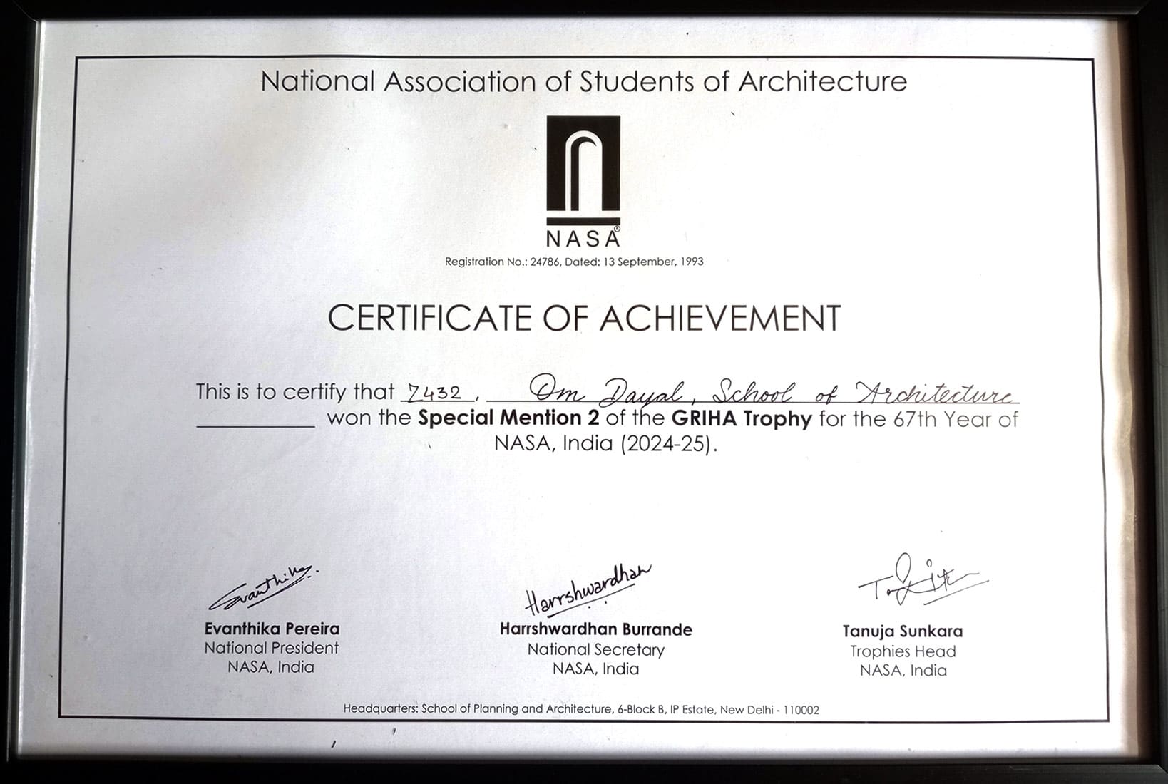We are delighted to share that Om Dayal College of Architecture (Z432) has secured a Special Mention 2 (3rd position) in the prestigious 67th year GRIHA Trophy at NASA India!